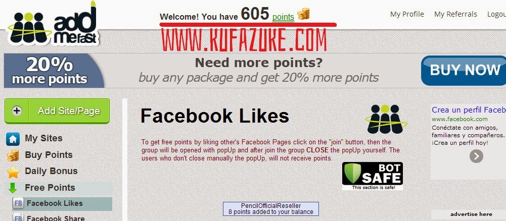 So, by now anda sudah pun dapat 50 point sebagai 'hadiah' register kepada Addmefast. So, let me explain about kegunaan points dalam Addmefast ni. Points ini adalah currency yang akan digunakan dalam exchange kepada LIKE, Follow, View dan sebagainya. Ia ibarat duit dalam hal ini.